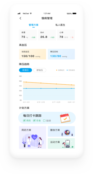 • With the goal of "improving treatment effects and reducing medical costs", the standard diagnosis and treatment guidelines for chronic diseases are implemented. Combining smart blood pressure, blood glucose and other IoT detection equipment with independent intellectual property rights, the detection data and analysis results are viewed in real time through the chronic disease management system, and integrated disease course intervention and management is promoted for the treatment of chronic diseases.